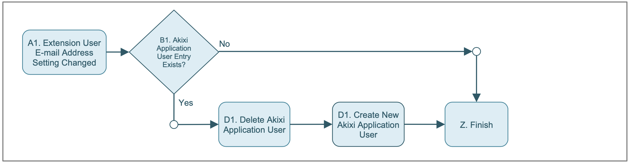 This use case covers the scenario where the e-mail address against an extension user is modified, and the change is propagated to the corresponding Akixi Application User if previously created. However, currently this scenario is not fully supported within the Akixi Web Services API without deleting the existing Application User and then recreating it from scratch. Unfortunately this has the detrimental effect of resetting the report configuration for the corresponding Akixi reporting supervisor User, where any previous report additions and/or changes made would be lost forever. Therefore, we would also encourage developers/integrators to show a warning confirmation within the provisioning system, whenever e-mail address changes are being made for extension users which have an associated Akixi reporting supervisor account.