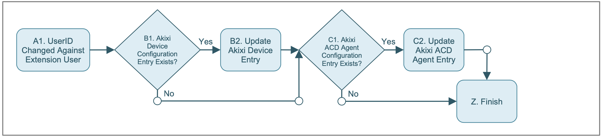 This case covers the scenario when the BroadWorks UserID value is changed against an extension user, which should be propagated to the corresponding Akixi Service Device & ACD Agent entries accordingly as appropriate.