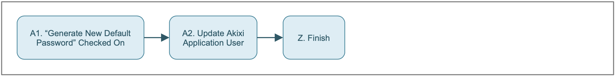 This scenario is when the “Generate New Default Password” setting is checked-on within the external provisioning system and the Apply button is clicked. A new random password should be generated for the corresponding Akixi Application User, and then the “Generate New Default Password” setting should be automatically unchecked as it shouldn’t be persisted anywhere and only exists in order to allow both the corresponding User to potentially be unlocked (if locked out), as well as new password credentials to be generated for them.