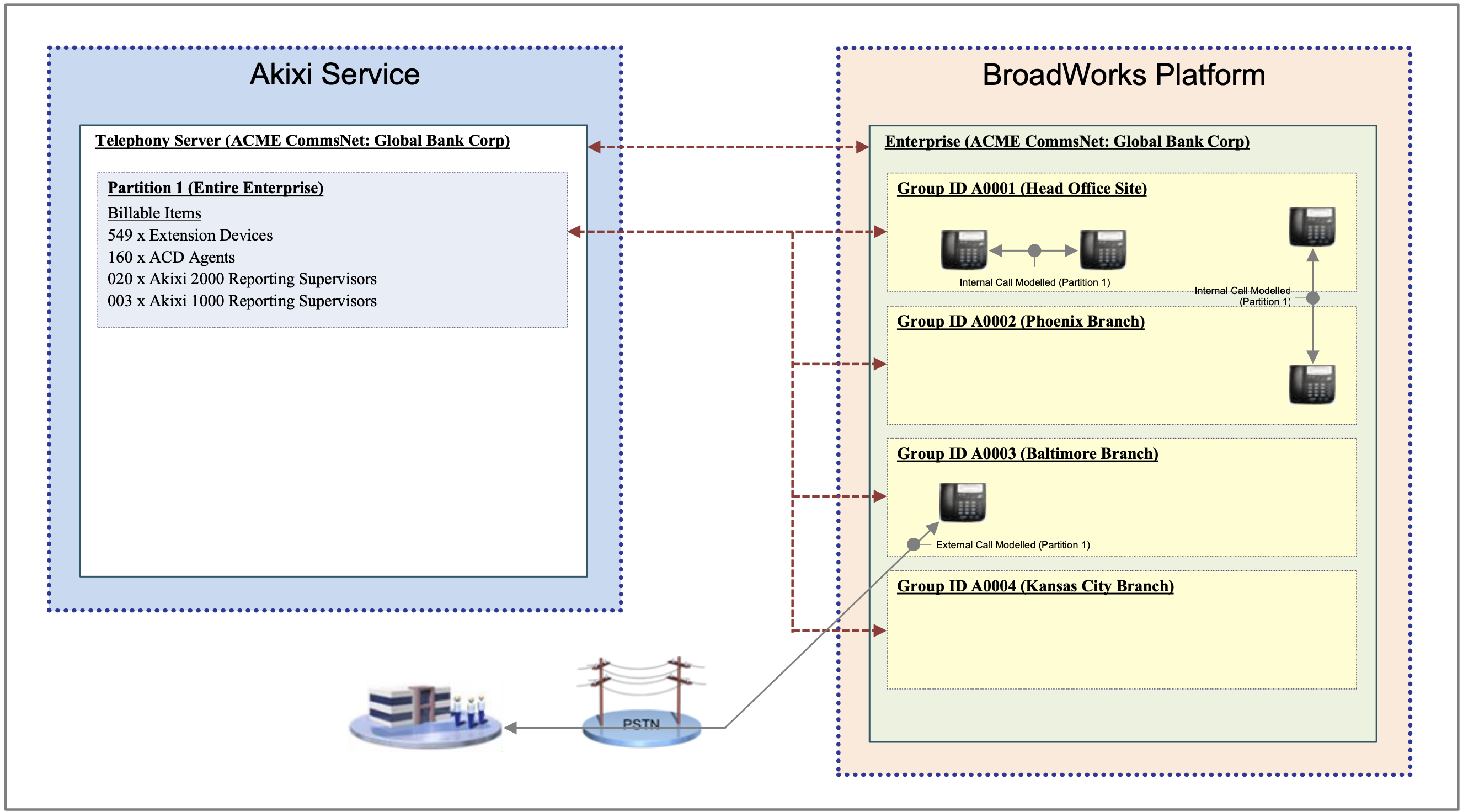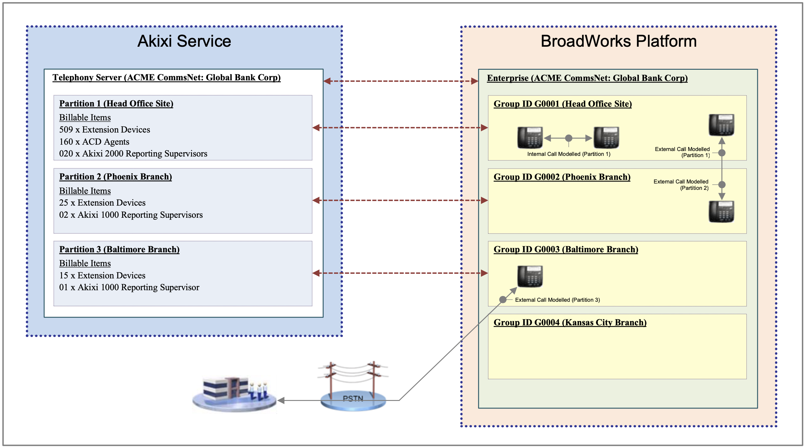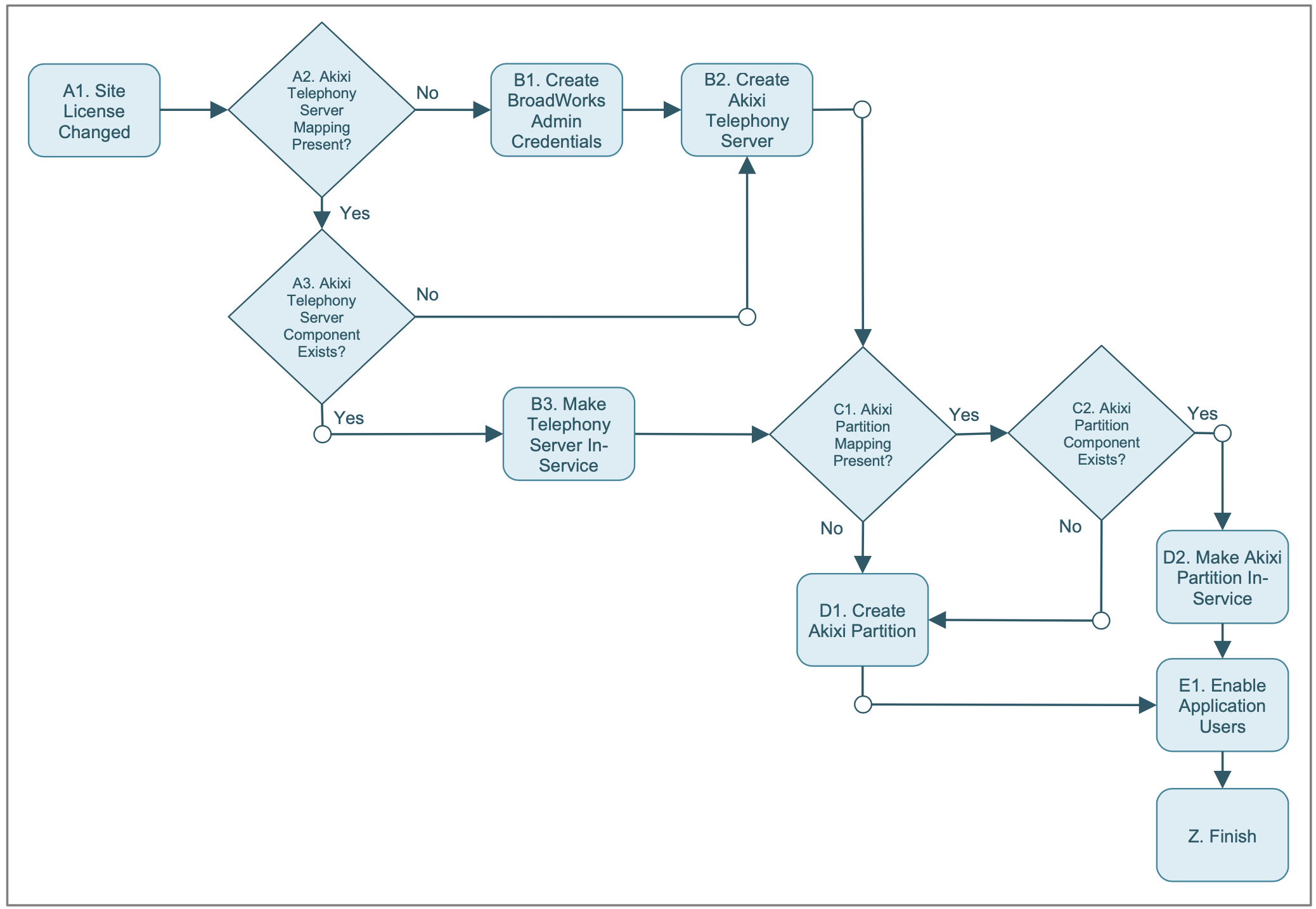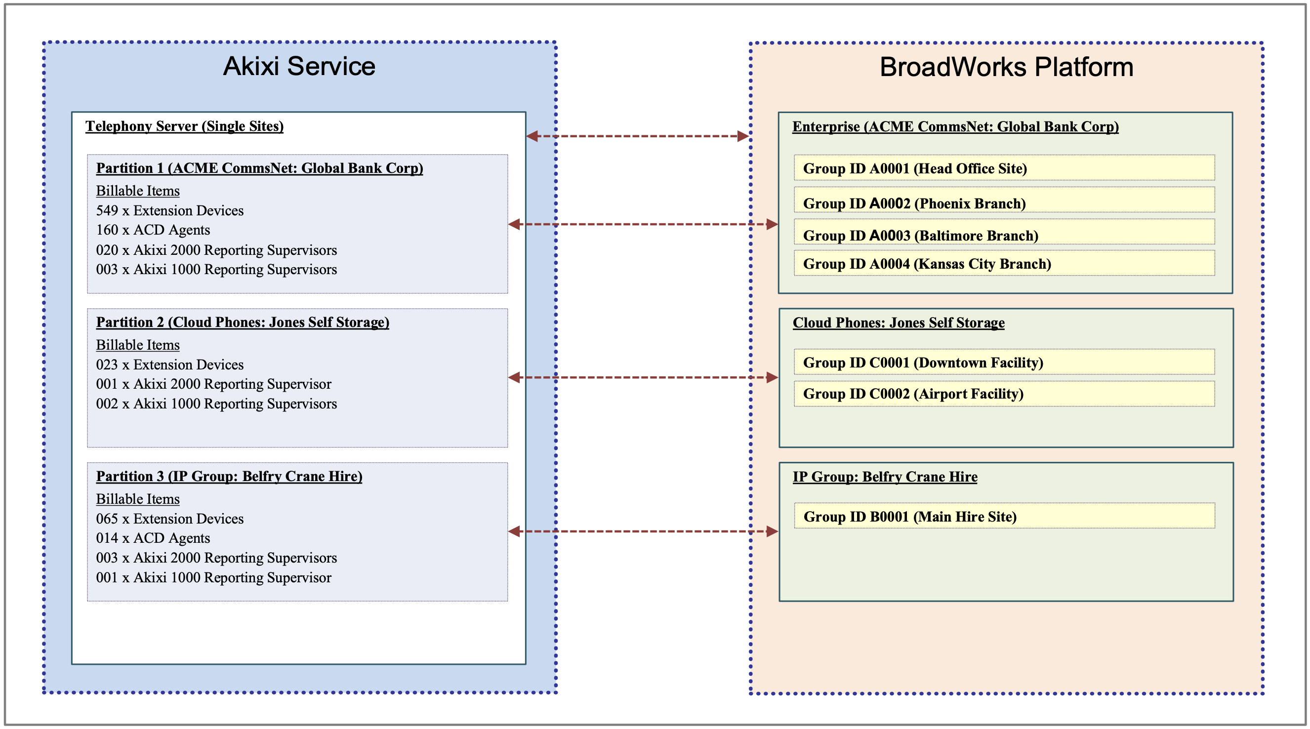 The external provisioning system should detect if it has an associated PartIDInTelSys value stored against the owning Customer telephony environment that the affecting configuration change was made within. This is used to detect whether the provisioning system has previously created an Akixi Partition component. As previously mentioned, for integration scheme 1, the PartIDInTelSys value should be stored by the provisioning system at the BroadWorks Group component level, but for integration schemes 2 & 3 it is stored at the BroadWorks Enterprise component level.