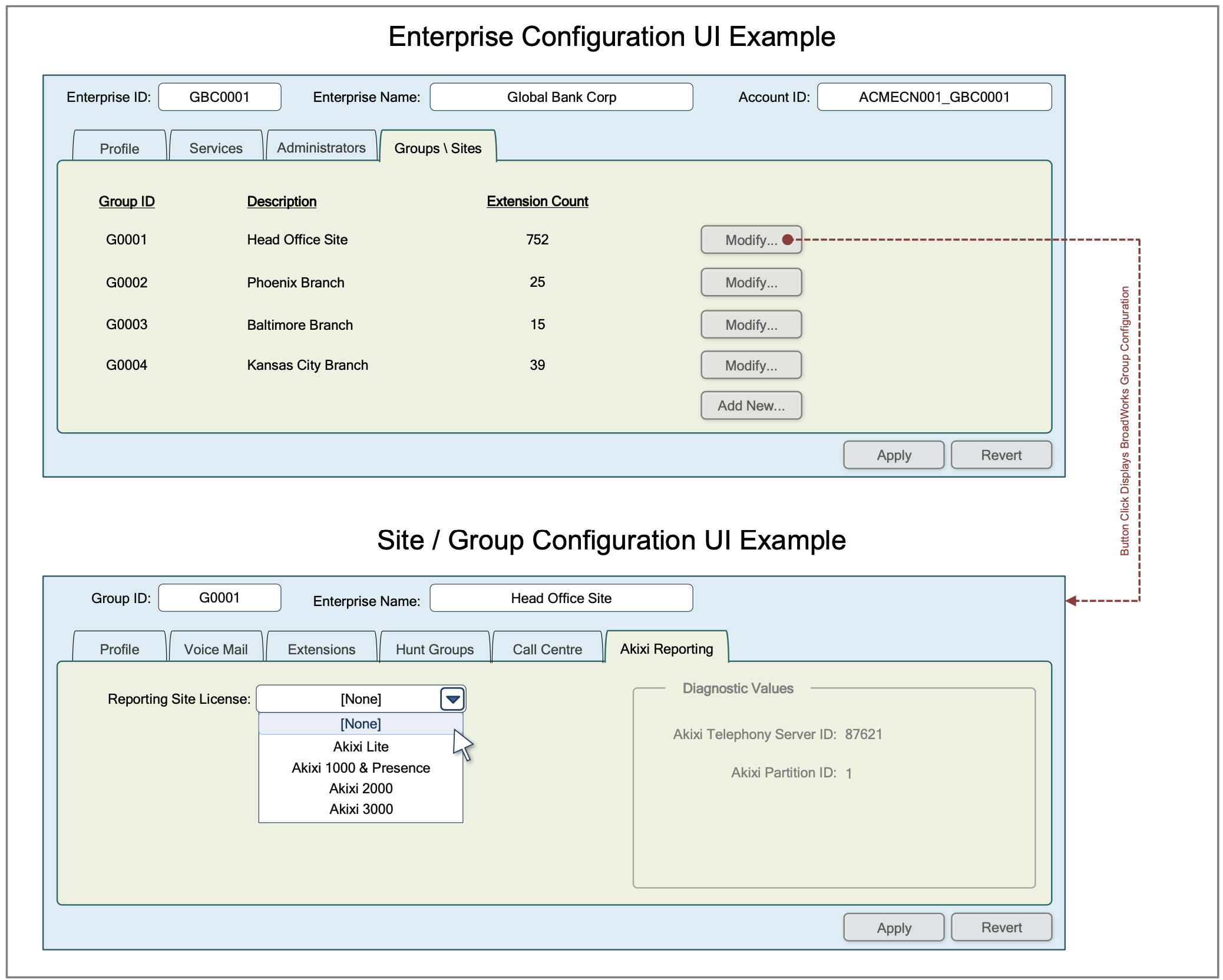 If the “Call Activity Monitored” setting is turned on for the corresponding extension user then the DeviceNumber – Endpoint Container Property should also be provided to set the User’s extension location in order to allow them to do call control actions within certain Akixi real-time reports. Note that determining the DeviceNumber value of the underlying Akixi Device entry matching the corresponding extension user, actually requires a DeviceList operation to be submitted for the associated Partition, and then verifying whether any of the returned Devices have a BroadWorks UserID value within the returned IDOnTelSys Property matching the corresponding extension user. These steps are not shown in the above flow diagram.