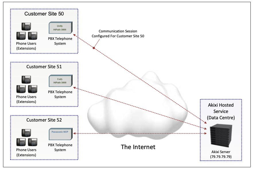 For PBX Customers, the Akixi Service is configured to communicate with each individual Customer PBX telephone system, which resides in the same physical location as the Customer’s extension handsets/endpoints.