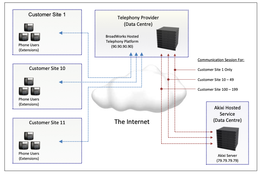 For hosted Customers, the Akixi Service is configured to communicate with the Telephony Provider’s core hosted platform, which is running in a data centre location. Depending on the number of Customer sites being supported, and also the platform access permissions granted by the Telephone Provider to Akixi, the Akixi Service may or may not need to maintain multiple communication sessions to the Provider’s platform for each separate Customer.